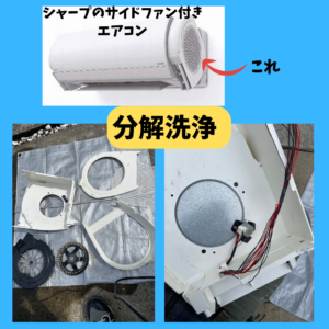 〈シャープのサイドファン付きエアコン〉分解が大変なため多くの業者が作業を断ると聞きます。種石空調ではホコリが溜まりやすいサイドファンまで完全に分解して洗浄いたします!